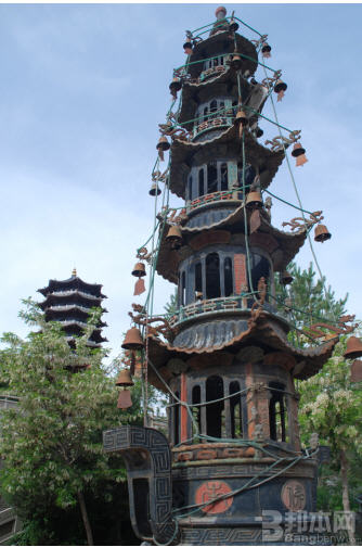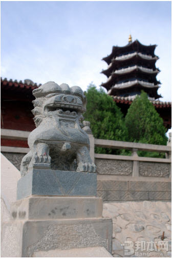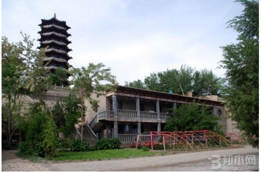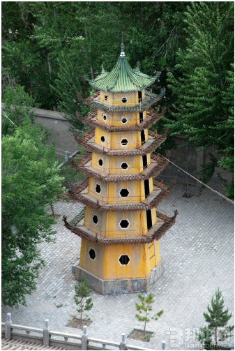 塔又称塔婆,意为方坟、高显或灭恶生善处等。《增一阿含 经》卷十九所说,世有佛、辟支佛、声闻、轮王可起塔供人礼拜。《造塔功德经》中详说造塔法以及造塔功德。说若人造塔,或大或小,“其状高妙出过三界,乃至 至小如庵罗果。所有表刹上至梵天,乃至至小犹如针等。所有轮盖覆彼大千,乃至至小犹如枣叶。于彼塔内藏掩如来所有舍利、发、牙、髭、爪,下至一分,或置如 来所有法藏十二部经,下至于一四句偈,其人功德如彼梵天。”又说,修造佛塔,可增长福德智慧;延寿、生天、灭五无间罪,最终成佛;其地坚牢、丰壤,龙天欢 喜,诸天护持地方社会安定团结,人民安乐。佛塔高40.8米,总建筑面积1100米2,地基深14米,可抗八级地震。为九层八角楼阁式,属于仿唐宋建筑风 格,开南北两门,外壁六面佛龛内为浮雕式佛像雕塑,内部围绕中心柱四面雕塑佛像,九层共36尊,外壁浮雕54尊,共计90尊。就其高度、规格,不仅是甘肃 第一塔,甚至是西部之第一佛塔。