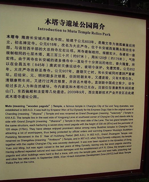 高塔为全木质结构,建成后塔高近百米,周长72米,比大雁塔高64米,全木质的结构令世人惊叹。唐高祖武德元年(公元618年),改寺名为大庄严寺,又因是全木质构架,所以改名为木塔寺,它是唐长安城最醒目的标志性建筑之一,也是长安城中最高的地方。大约从长安城建成开始,一直到当代高层建筑没有风行之前,这几千年间,它都是长安城的第一高度的建筑。几个世纪以来,木塔寺虽几经战火洗礼与重建,但在清代以后因寺内木塔被拆,殿阁楼宇毁损才逐渐凋零。