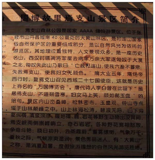焉支山,亦名胭脂山、燕支山、删丹山,又称大黄山。位于张掖市山丹县城南50公里处,东西长约 三十四公里,南北宽约二十公里。焉支山森林公园是一九九三年经甘肃省林业厅批准成立的省级森林公园,是以自然风光为依托的游览区。林区南部是世界第二,亚 洲第一的军马场。区内有唐玄宗天宝年间建的钟山寺旧址,历史上有名的“万国博览会”遗址,复建的宗教胜地玉皇殿、大佛殿,更有山丹十景之一的“删丹朝 晖”,唐代诗人李白曾在此留下“虽居焉支山,不到溯雪寒”的绝句。区内重峦叠嶂,松林密布。山上林海松涛,碧波无际,山下沟壑纵横,清泉淙淙。腹地,獐 鹿、岩羊等野生动物出没其间,峡谷两侧崇山峭立,奇石岩岩。秋日,各种野花竞相怒放,争奇斗艳;晓日初升,云兴霞蔚,重雾缥缈,气象万千。秋夏之际,这里 气候凉爽湿润,景色秀丽迷人,素有“小黄山”之称。是消夏避暑,度假旅游不可多得的自然风光游览胜地。