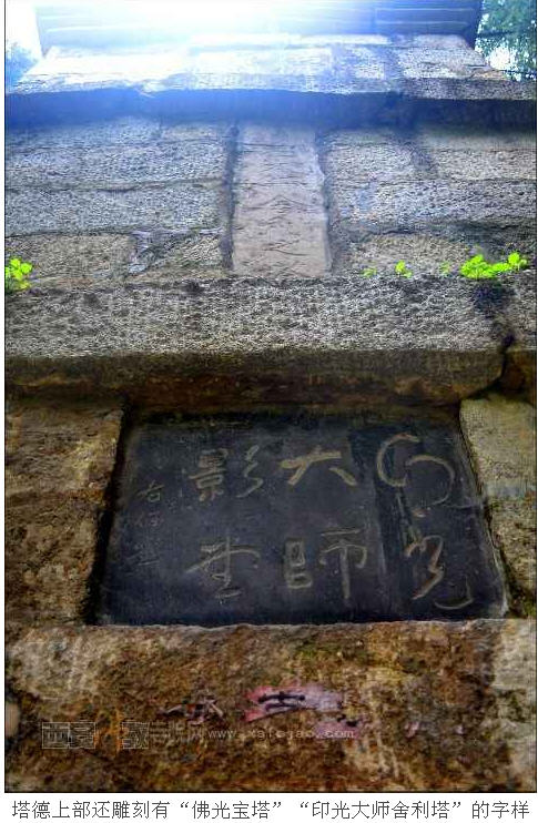 印光法师影堂石塔,方形石砌三层结构,通高8.41米,底边周长3.55米,中间有两层腰檐,塔身收分较急,顶端为石雕宝瓶式。塔的底层东面辟有方形的石门,修筑有方形的塔室,里面嵌有两方石碣。
