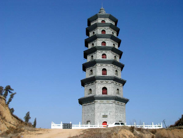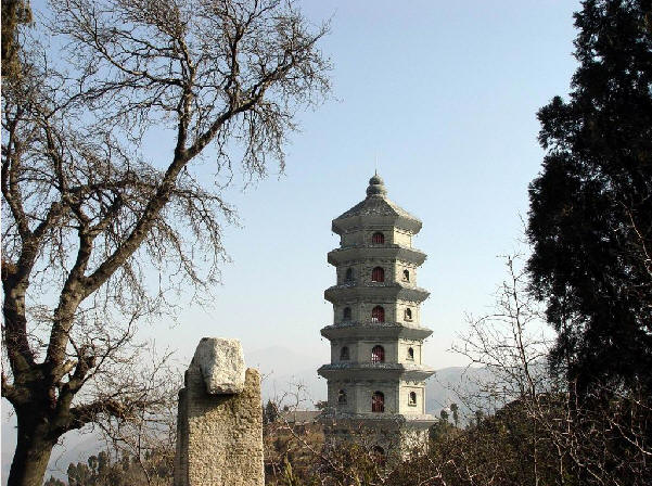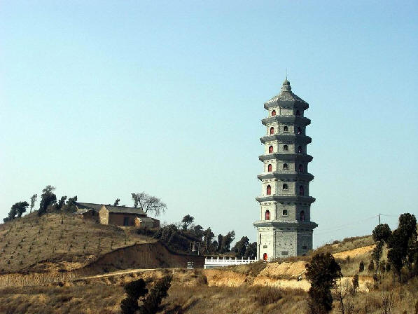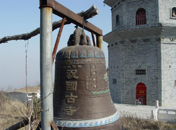 竹篑山,山上有一座寺便是竹篑寺,(小时侯我们一直叫中国寺)现在叫祝国寺。它相距 我家直线距离也就是三公里,距县城五公里。海拔高度据说900多米,很早以前是我们县的八景之 一。祝国寺建有一座佛塔。原塔始建于明万历年间,(公元1653年)佛塔为六角方型七级浮图塔 原供奉有高僧灵骨舍利子。(现在供奉的可是我们县某位大人物先人的骨灰,另有一座铜像。) 在塔的东西两侧各有两个小高地,分别建有寺院人们叫它东寺`西寺。每年农历六月六日为古庙会, 初五下午上山朝拜的人们便往山上去,我们叫朝山。据说兴盛时有三,四万人之多。可惜的是在文 化大革命中,破除封建迷信,记得是在一个早上,佛塔轰然倒地,被毁了,建于民国时期的东`西 寺被焚, 只剩下断壁残垣。原在半山的小路上,也不只是那一位行善之人,修建的供朝山人们休 息,喝水的汤房也不复存在。现在只剩下破庙二十四间,佛像数尊。