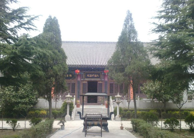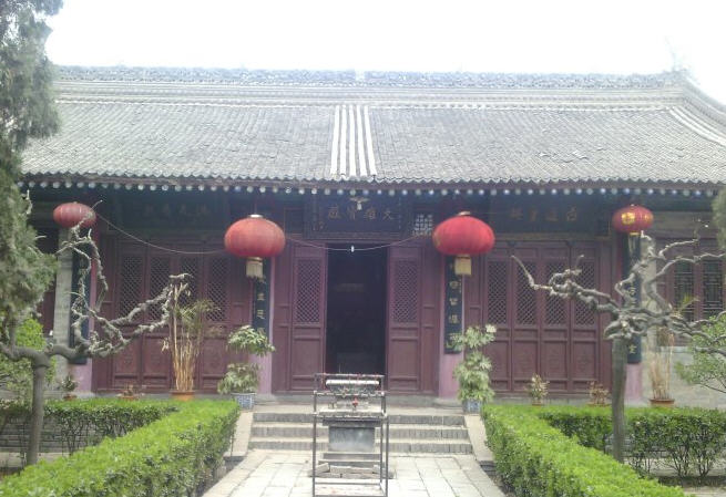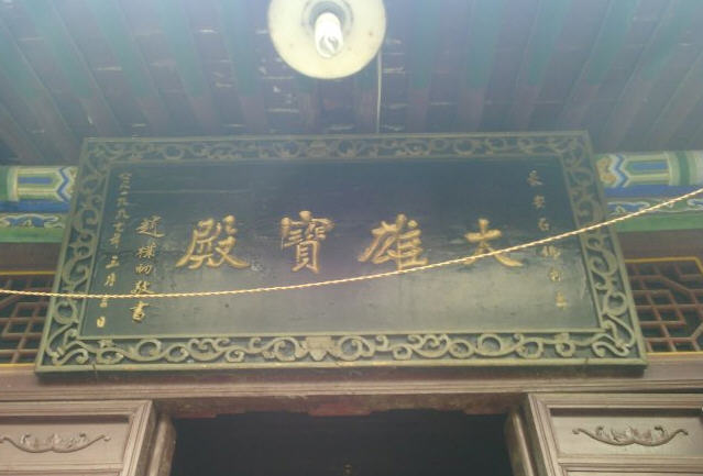 进入山门,前殿是五开间大雄宝殿,匾额是赵朴初题写。殿内供奉横三世佛,两旁小龛左边观世音菩萨,右边地藏王菩萨。三世佛像前有小型佛母孔雀明王像。大殿背部是观音菩萨和龙女善财童子,以及韦陀菩萨。大雄宝殿内有书架摆着各种佛教书籍,供大家结缘取阅。