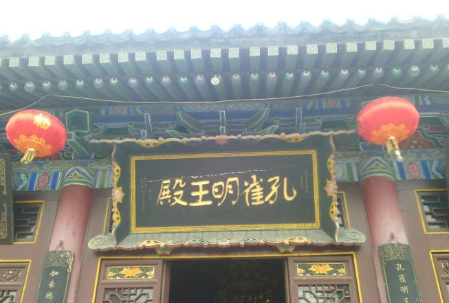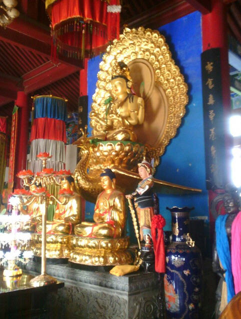 大雄宝殿后面是七开间的孔雀明王殿,匾额是释见如法师题写。殿内正中供奉的佛母孔雀明王像庄严肃穆,金光熠熠。孔雀明王像是铜铸贴金彩绘像,高约五米,重5000斤,置于一米高的石雕须弥座上,是目前国内最高大的孔雀明王铜佛造像。孔雀明王头带五佛宝冠,璎珞耳珰臂钏种种庄严,结跏趺坐在莲花座上,乘金色孔雀王。孔雀明王现慈悲相,一面四臂。右边第一手置腰间拿着莲华,莲花开敷在左肩上部;第二手掌心向上平托着因缘果。左边第一手当心,掌心向上拇指微开护持着吉祥果;第二手向左举,手握着孔雀尾。金色孔雀王双翅平展,双腿直立在五彩祥云上。此佛像造型精良,光华四射,而壁宇生辉。前面有小型横三世佛,左右伽南菩萨韦陀菩萨,另有哼哈二将护法金刚。