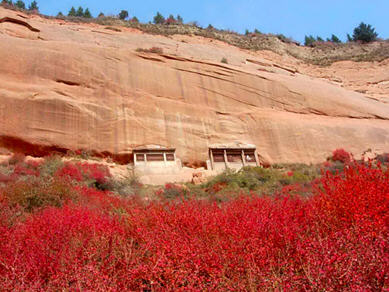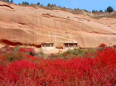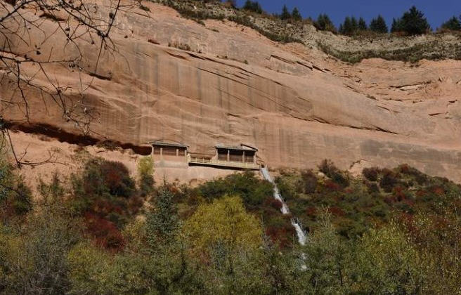金塔寺石窟位于马蹄北寺东南面10公里的大都马河西岸,高悬刺沟的红砂岩崖壁上,距离地表约60米 ,洞窟虽只有两孔,但内容、题材之丰富、复杂,雕饰之多变和保存情况来看,是马蹄寺石窟群中最有研 究价值和文物价值的石窟。