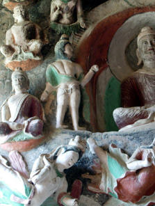 金塔寺石窟,分东西两窟。两处均有中心塔柱式石窟组成,东窟中心塔四面分三层开龛造像,两面三层两侧有释迦牟尼像、西面中层有弥勒像、北面龛外有迦叶、 阿难塑像,两佛的不同性格刻画得十分逼真;西窟中心塔西面中层塑有思维菩萨;另外在东窟中心塔下层龛中西窟中心塔西面上层,中层龛均塑有菩萨这些塑像思路 大胆、独具匠心,充分利用了有限的空间,弟子、佛、菩萨不同层次、不同形态的佛像的群体形象塑造艺术,其形象和内容表现手法都达到了登峰造极的高度。然而 最有生气的精典之作诸如飞天,飞天谓散花女,为佛教天龙八部之一,因其身有香味,也谓香神,以千姿百态的形式展现出赞礼、奏乐、歌舞等优美形态。两窟中心 塔柱上都布满了凌高翱翔的众飞天。形态各异,造型生动,像神又像人,眼窝略凹,鼻梁教凸,与东南亚人十分相似,这与受东南亚佛像风格有关,个个都像外来之 客,立体感极强,是全国罕见的,著名考古家史岩对马蹄寺飞天的评价是“艺术成就比较莫高窟钠中小型乳雕式德平面影塑提高了一步”、“是具有伟大气魄的高肉 雕大型之类’’。 这些飞天,据说是从印度加尔各答非来的大成就者,8 O位女性落到了金塔寺,由于这些稀客的到来,以及其文物的价值,多年来,一直受到中外学者极大关注。