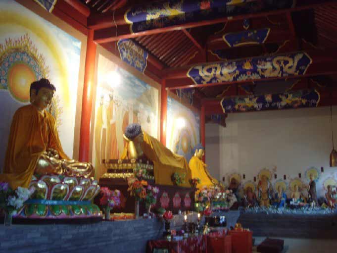 石阻犁深挖,抛出了石佛雕像和部分文物,于是村上居士发心建寺。由王居士和马居士筹划领工,盖起寺院(四合院十二间),上殿三间,塑有三世古佛,十八罗汉,前殿三间将石佛泥雕塑成卧佛,周围围着十大弟子,卧佛屏后假山下是一尊倒坐观音,靠着两边山墙塑了二十四诸天。两个大殿雕梁画栋,飞檐走兽,店内壁上全是壁画,栩栩如生,上殿前有古柏两棵,黄杨树两丛,院内植四棵梧桐,两旁六间是道房。前殿门外是千年国槐(五楼有余),右侧有一石架大铁钟(国民党第七分校抗战时已毁),左侧山间前有一直径约两米的椭圆形莲花上,花纹清晰,石面有长方形石膏,膏前是两个光脚,据说是寺院建后在附近废墟发现的看样子是石佛的底座。
