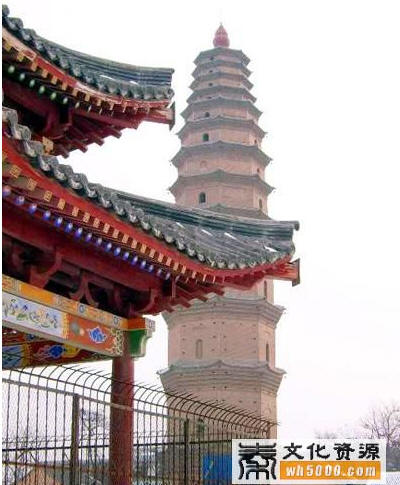 高陵塔,唐代,建于大中年间,高53米,8棱13级,塔底直径9米,底层有南北两个卷门,其余各层皆有东西南北四门,塔梯内绕,直至塔顶。塔为密檐式砖塔。顶为圆形宝瓶式,每层叠涩出檐,用二砖和牙子各两砖交错砌筑至第八砖后作出假飞檐。各檐角微上挑,结构精巧而坚固。