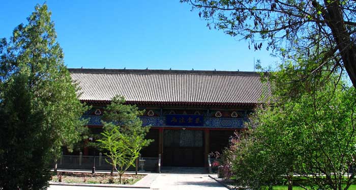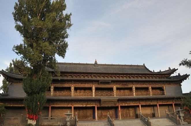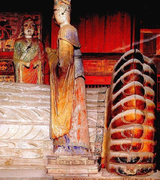 大佛殿为全寺主体建筑,坐东西面,为两层楼结构,重檐歇山顶,高20.2米,宽 48.3米,进深24.5。面阔九间,进深七间,总面积1370平方米。四周木构廊庑。殿檐下额枋上雕有龙、虎、狮、象等。正门两侧嵌各用50块方砖拼成 的浅浮雕两幅,每幅4.6米见方,刻工精细,富丽浑厚,是砖雕艺术的精品。殿内彩塑现存31雕。正中佛壇上,塑释迦牟尼涅槃像,身长35米,肩宽7.5, 佛手指中可睡一人,是国内现存最大的泥塑卧佛。像为木胎泥塑,中空。金妆彩绘,面部贴金,右胁而卧。造像丰满端秀,怡静安详。大佛身后塑迦叶、阿汉等十大 弟子,南北两侧塑十八罗汉,间隔得体,色彩胁调,神熊各异,栩栩如生。大殿四壁和二层板壁上绘有壁书,约530平方米,内容有佛、菩萨、弟子、诸天神将、 佛经故事及《西游记》人物等,线条流畅,色泽清丽。