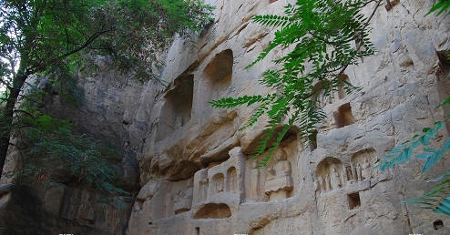 第1龛为一佛二菩萨;主佛高0.28米,结跏跌坐。第:龛也是一佛二菩萨,结跏跌坐佛高1.07米,上身残缺,佛座为束腰八角形须弥座。有磨光圆形头光与背光。二菩萨高0.92米,高发髻,上身袒露,斜披胸巾,下身著长裙,跣足立于圆形仰覆莲台。第3龛为一佛二弟子二菩萨,主佛结跏跌坐,著双领下垂衣,右手作说法印。有圆形头光。第4龛形制与大小部和第3龛相似。但被崖前建筑所挡。造像不清。第5龛是一尊立菩萨像,高0.27米,头已残,右手科举于胸前,左手下垂,足踏仰覆莲台。第6龛为一佛二弟子二菩萨。结跏跌坐佛高0.3l米,著双领下垂衣,作说法印:二弟广双手叠放十腹前,足踏仰覆莲台。第7龛为一佛二菩萨,结跏跌坐佛高0.73米;左手抚于左膝,右手作说法印,著双领下垂衣,佛座为束腰八角形须弥座。第8龛为二菩萨立像,像高0.32米,二菩萨造型相同,高发髻,上身袒露,下穿长裙,帔帛垂于体侧,足踏仰莲台。第9龛为五尊像,一佛二弟子二菩萨,结跏趺坐佛高0.25米,右手作说法印,二弟子双手叠于腹前,足踏圆形仰覆莲台。第10龛亦为二菩萨立像,高0.36米。第ll龛为一佛二弟子二菩萨),佛高0.94米,结跏趺坐于束腰八角形叠涩座,左手抚左膝,右手作说法印,著双领下垂衣。第12龛为一佛二弟子二菩萨,结跏趺坐佛高0.82米,右手作说法印。第13龛为一较大龛,龛高1.6米,宽1.67米,深0.6米,造像为一佛二弟子二菩萨,结跏趺坐佛头部已残,坐于八角形束腰须弥座,龛下原有发愿文,今字迹不存。第14龛高1.3米,一佛二弟子二菩萨,结跏趺坐佛高0.87米,著双领下垂衣,内有交领式僧只支,坐于八角形束腰须弥座。佛后有圆形背光和桃形背光。左侧弟子为老者形象,右侧弟子双手叠放腹前。弟子与菩萨均足踏素面圆形仰覆莲台。第15龛为二佛并立像,龛高0.36米,二佛均著通肩衣,均以内侧手臂作说法印,衣薄贴体,动作相同但对称,足踏圆形仰覆莲台。第16龛为一碑龛,从内容看应为晚期题游。第17龛为一佛二弟子二菩萨(图98),佛为立像,高0.95米,著通肩大衣,双臂已残,原右前臂横于腰际,头后有桃形头光,足踏素面仰莲台。弟子身材较矮,左弟子为老者形象,著右袒式袈裟,双手合十。右弟子为青年形象,著交领式袈裟。二菩萨身躯也较矮,头束高髻,动作相同但方向相反。第18龛为立菩萨一躯,高1.9米,即等身观世音菩萨像,面相长圆,头饰高髻,双肩宽圆,右手上扬似执有莲蕾,左手下垂提帔帛,上身袒露,帔帛与胸巾残留有朱砂彩痕。第18龛以西约15米处有一未完成的石窟,宽5.2米,高5米,深2.2米。第19龛位于窟内壁偏西部位,龛内主尊著菩萨装,高0.76米,左腿盘起,右膝曲呈蹲坐状,右臂弯曲搭于右膝上。上身袒露,下著长裙。像左右各一供养人像。洞内东壁有此龛的发愿文,时为“大明嘉靖元年岁在壬午”,即1522年。