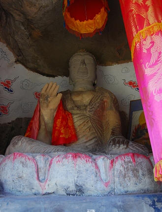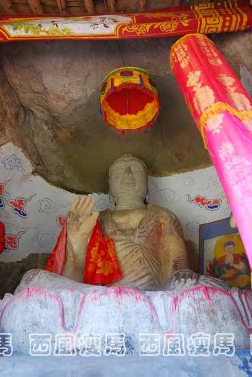 石鼓峡石窟位于鳞游县北五公里左右澄水河的石鼓峡西岸边,仅存一窟,窟口向东。平面近于马蹄形,开凿不甚规整,宽3.67米,高4米,深2.75米,窟中雕坐佛一尊。佛高1.8米,结跏趺坐子大莲花上,左手抚膝,右手施无畏印(图120),著双领-—f;垂大衣,内有僧只支。衣摆覆于莲台表面,莲台平面呈三分之二圆形,高35厘米,为双层办的仰莲台。佛身躯有些肥胖?肚微挺,头略显小。窟内有题记十则,其中年代最早者为西壁主佛右侧元和四年年(809)题记:“都勾当入素(?)李口叙下手造,元和四年口月五日。”