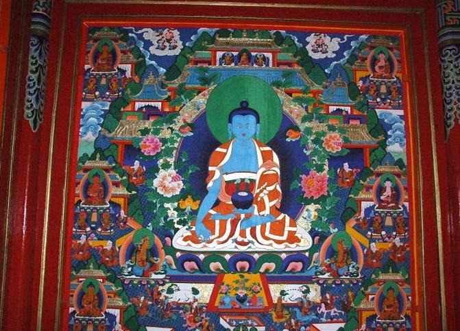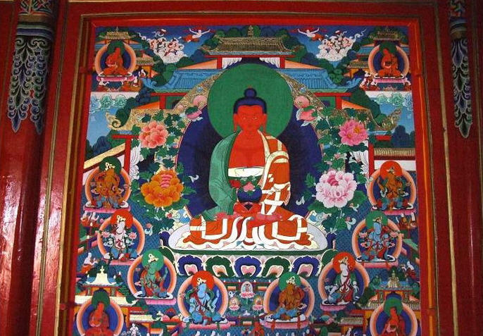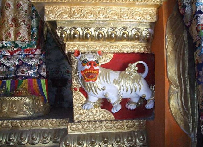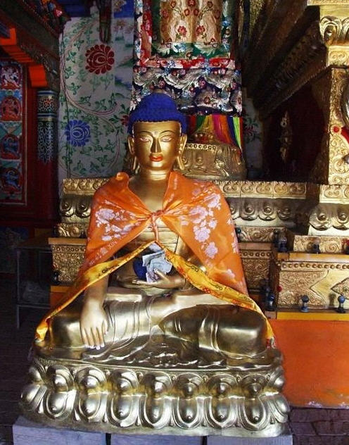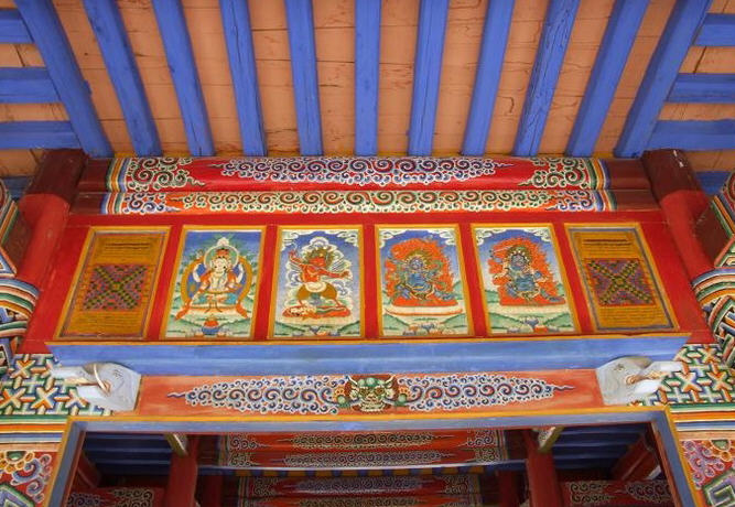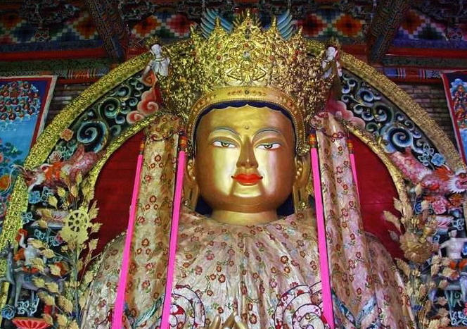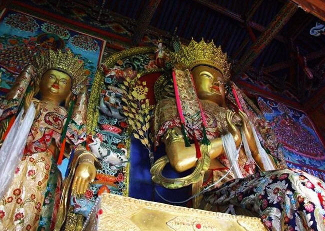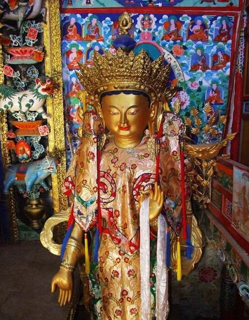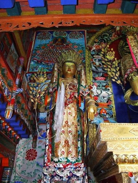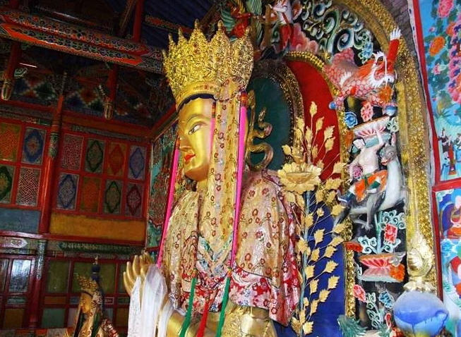 弥勒佛殿内供弥勒佛巨型坐像,高达7米,是青海省境内最大的佛像。护法神殿内供大威德佛、六臂护法神、吉祥天母。文殊菩萨殿内供文殊菩萨、不动佛、药师佛。阿饶仓大师佛堂内供洛迦夏惹、观音及弥勒佛。