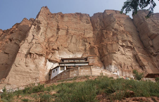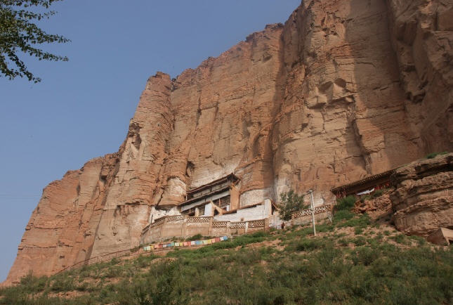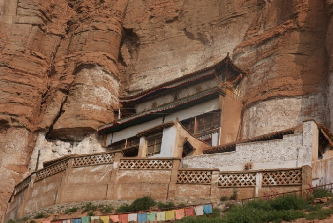 远望该寺,依山而建,凿孔架梁,似凌空而起。走进她的身边,玲珑精巧的门楼使你眼前一亮。门楼为三层横木方斗拱歇山顶式阁楼,每层四周皆以斗拱托起屋顶,简瓦铺面,四角高挑,横脊竖脊以镂空雕花青砖砌成,上饰龙头砖雕。最高层横脊上塑有镏金双鹿灵芝,光彩夺目。门楼木结构以矿物颜料绘以金龙金凤,浮云花卉,色彩艳丽,经久不褪。门楼整体巍峨险峻,雍容华贵。据说像这种建筑的门楼在青海再无第二。不仅 如此,其门楼尚有玄妙之处,大风刮来,整个楼体颤颤悠悠,左右摇摆,但自建成已有200多年结构还完好如初。