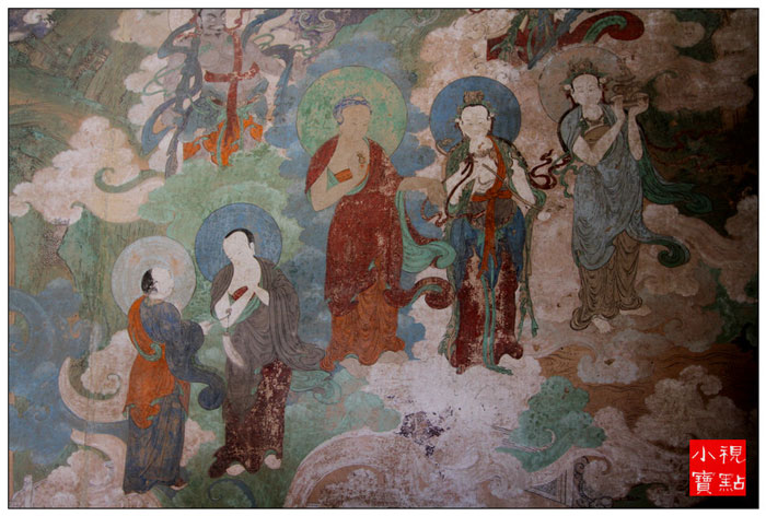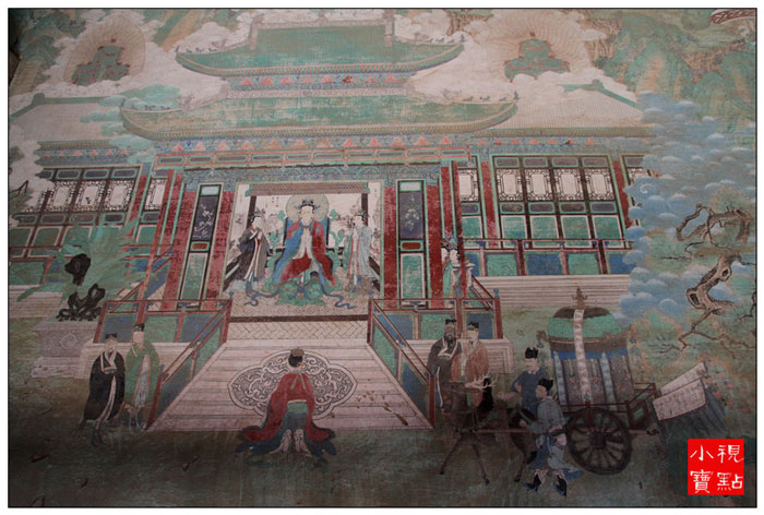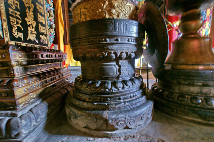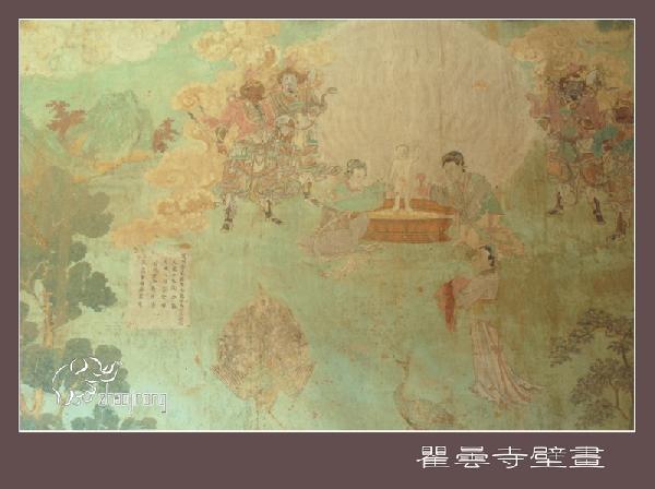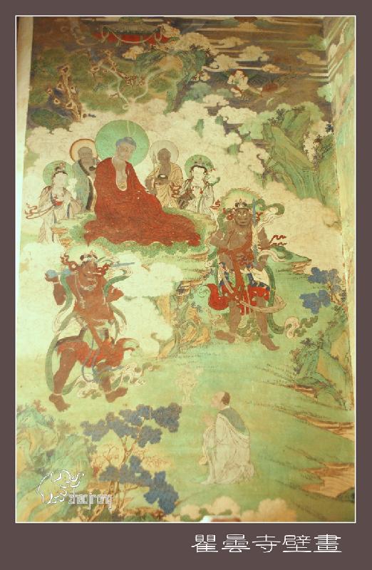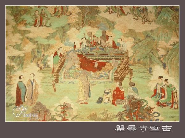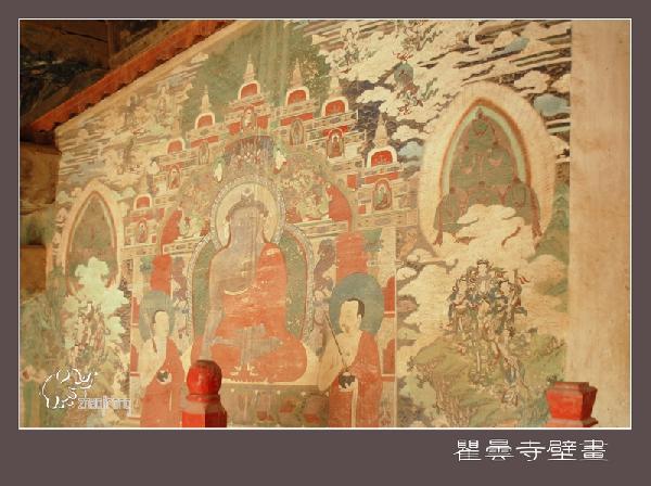 隆国殿,俗称大殿,和瞿昙寺殿、宝光殿在同一条中轴线上,是全寺最高大壮丽的建筑,面积约900平方米,重檐庑殿顶,四面设明廊,屹立在宽大的须弥座台基上,前面伸出月台一方,月台左右各设踏垛九级,四面以红砂石栏杆围绕。大小钟鼓楼分别在隆国殿前左右两侧,东西对峙,上设隔扇槛窗,平台外加护栏,可供游人凭栏远眺,欣赏寺内外风光。 壁画廊的巨幅彩色壁画,即所谓“七十二间走水厅”,面积约400平方米,堪称为该寺艺术之最。壁画所绘,多为佛教传说故事。“叨利天众迎佛升天宫图”、“善明菩萨在无忧树下降生”、“净饭王新城七宝衣履太子体”、“龙王迎佛入龙宫图”、“六宫娱女雾太子归宫图”等等。构思巧妙,驰骋想象,贯通三界,纵横太空。技法之纯熟,形象之生动,达到很高的境界,虽历经五百余年,色彩依然鲜艳夺目。德国、加拿大、澳大利亚等国外宾曾来参观,其中有人赞叹说:“画技精炼,构思奇特,真是画中瑰宝,不可多得”。