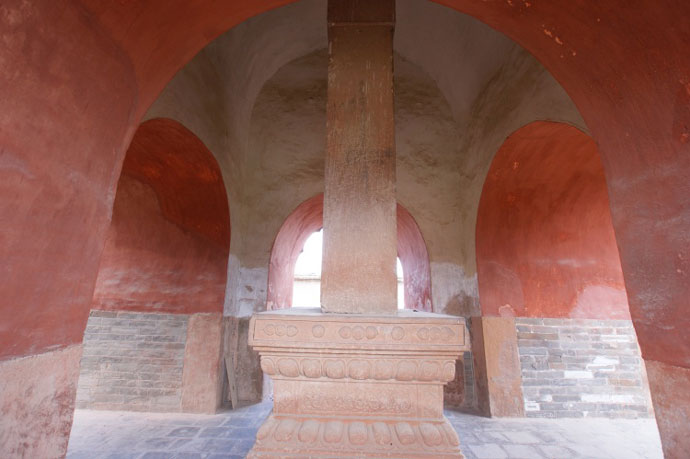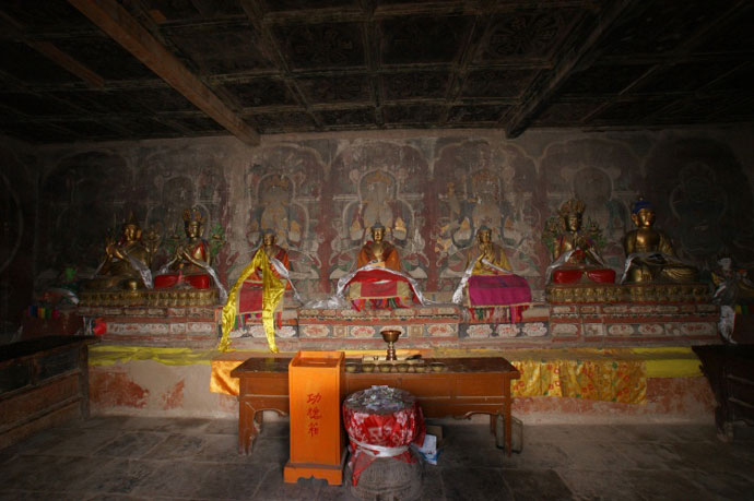 是一座重檐歇山式建筑,内檐门额上悬有敕赐金书“瞿昙寺”三字的横匾一方,下款有“大明洪武二十六年立”字样。瞿昙寺殿虽经补修,但完好地保留了原来的建筑风格和规模。殿内塑有三大古佛,8尊菩萨像,还有清光绪十二年(1886年)施的铜灯一盏,殿门外有明永乐年间(1403—1424)施的乌金大煨炉一个。有“独尊”匾一块,书法浑厚庄重,遒劲有力。殿内两侧和内夹墙墙壁上绘满各式精美的壁画,是明代壁画精品。