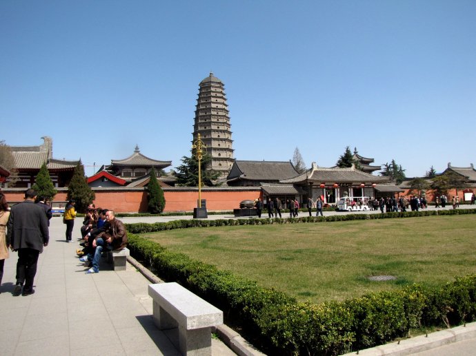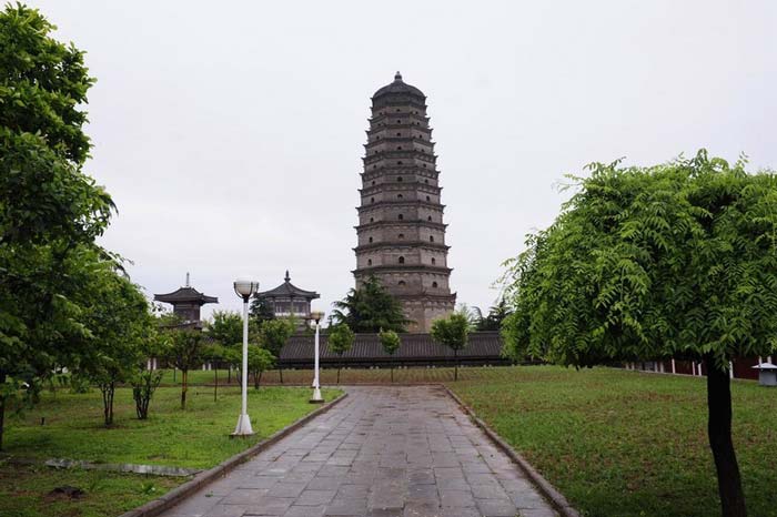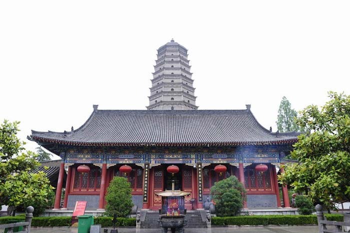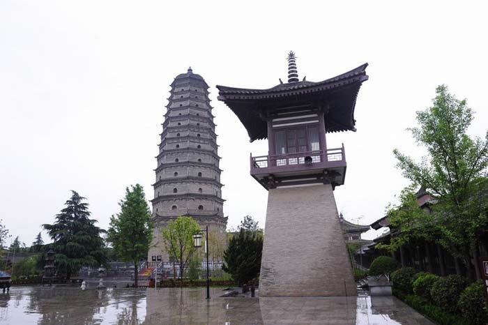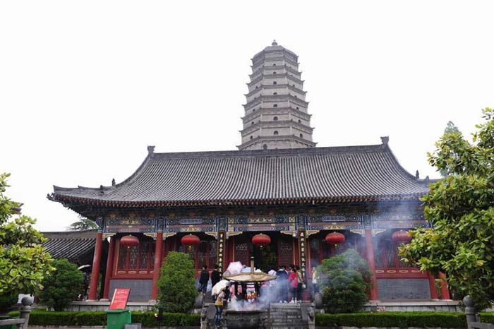 宋代法门寺承袭了唐代皇家寺院之宏阔气势,被恢复到最大规模,当时仅二十四院之一的“浴室院”即可日浴千人。宋徽宗曾手书“皇帝佛国”四字于山门之上。金元之际,法门寺仍是关中名刹,“藏经碑”中有寺僧抄写大藏经5000卷之记载。金人也刻“诗碑”盛赞其寺塔:“三级风檐压鲁地,九盘轮相壮秦川”。明清以后,法门寺逐渐衰落。明隆庆三年(1569),历经数百年历史的唐代四级木塔崩塌。明神宗万历七年(1579),地方绅士杨禹臣、党万良等捐资修塔,历时30年建成八棱十三级砖塔,高四十七米,极为壮观。清顺治十一年(1654)因地震塔体倾斜裂缝。民国二十八年(1939)在爱国志士朱子桥先生的主持下,完成了晚明以来最大规模的维修。文革期间,红卫兵欲挖地开塔,良卿法师点火自焚,用自己的生命保护了塔下珍宝。