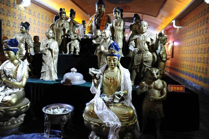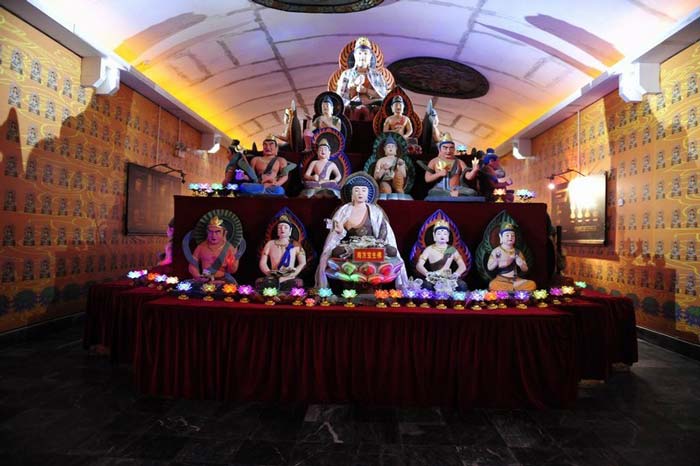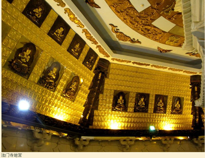 唐代200多年间,先后有高宗、武后、中宗、肃宗、德宗、宪宗、懿宗和僖宗八位皇帝六迎二送供养佛指舍利。每次迎送声势浩大,朝野轰动,皇帝顶礼膜拜,等级之高,绝无仅有。据史载 “三十年一开,则岁丰人和”,可干戈平息,国泰民安,风调雨顺。咸通十五年(874)正月四日,唐僖宗李儇最后一次送还佛骨时,按照佛教仪轨,将佛指舍利及数千件稀世珍宝一同封入塔下地宫,用唐密曼荼罗结坛供养。唐代诸帝笃信佛法,对舍利虔诚供养,寺院大小乘并弘,显密圆融,使法门寺成为皇家寺院及举世仰望的佛教圣地。佛塔被誉为“护国真身宝塔”。
