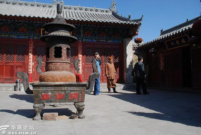 到关帝庙要上一个很长的踏步台阶,估计有三四层楼房那么高,关老爷就被供奉在这高高在上的庙宇里。关帝庙与孤山镇的政府大院之隔一条马路,跨过马路对面就是孤山镇政府。关帝庙的一切都是新修的,几乎没有一件东西和建筑是古时候遗留下来的。关帝庙有一个管理庙宇的僧人。