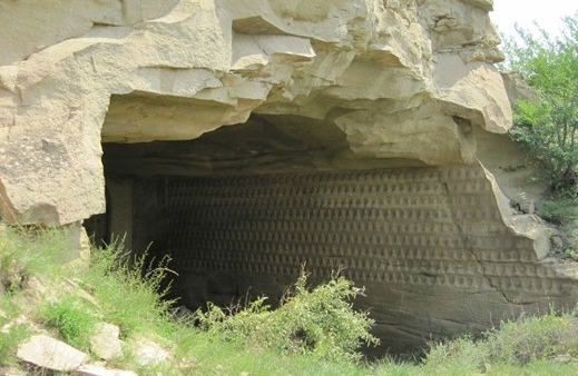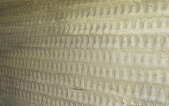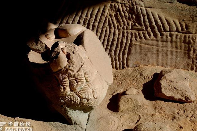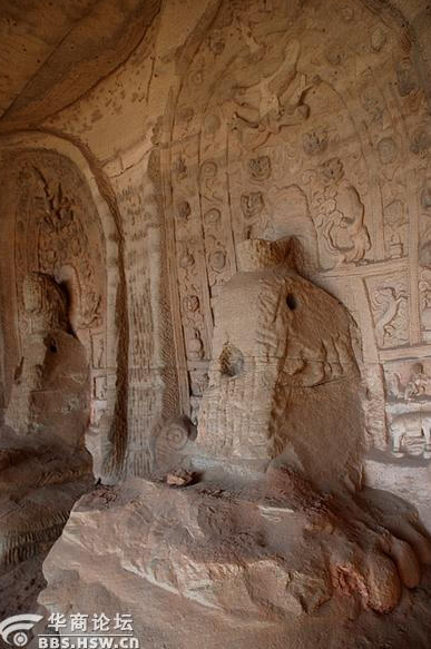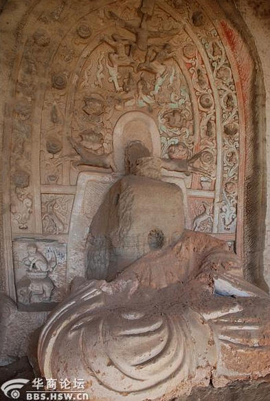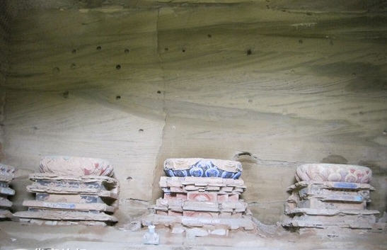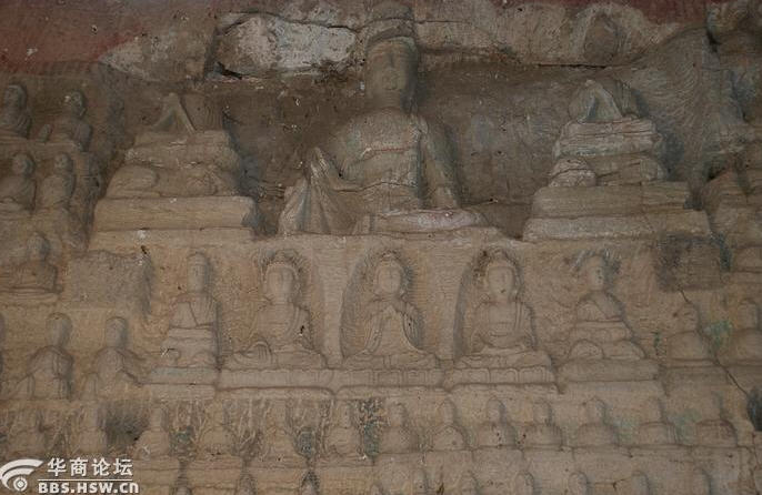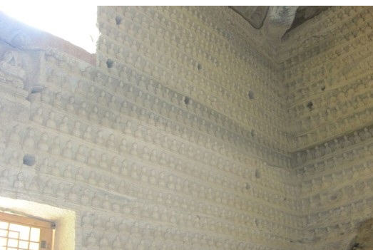 如今我们能看到千佛洞的洞门已经坍塌,佛洞也只留下半截的佛洞,外边的一截已坍塌成了山体,只留下靠里边的半截洞体。但洞内壁上雕刻的佛像依稀可见,千佛洞的左右两侧的墙壁上全是雕刻的石佛,只是因时间的原因风化的比较严重。对着洞口的墙壁上有三座佛像,还比较完好,只是由于风化严重不大能看出是那路神仙,佛洞地面上已覆盖有一寸多厚黄土灰尘,看样子像是佛洞风化的残留物,佛洞的顶部有一圆形的雕刻因风化看不出图形只能看个形状的轮廓。