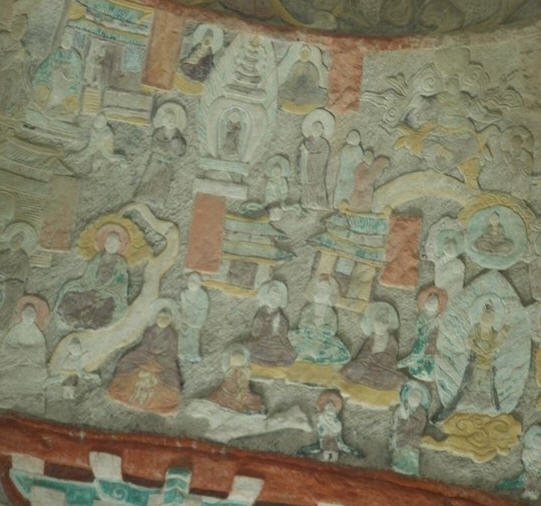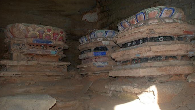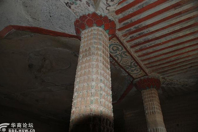 其实进入万佛洞里面看,并非是两层结构的佛洞,只是一层结构且非常宽阔的佛洞,中间雕琢出两根高大的方形石柱,貌似两石根柱子在支撑着这个偌大的佛洞顶部,石柱的四周也都雕刻满是佛像,佛洞的石柱和屋顶的颜色非常的鲜艳,感觉是后人重新描绘上去一般,对着门的墙壁上原来应该有雕刻的神像,但佛像都已风化坍塌,只有佛像的基座形状还在,右侧洞壁上佛像也非常的完好,左侧是几尊佛像的底座,但佛像已经不在,但底座还非常的完好,且颜色清晰,左侧的墙壁上看上去有描绘的壁画,虽然隐约能看清一点颜色,但看不出壁画的内容,佛洞的门框上还贴有今人书写的对联,看来这里曾经有人来朝拜过,只是没有很好的保护和修缮才导致千佛洞万佛洞破落成今天这样。