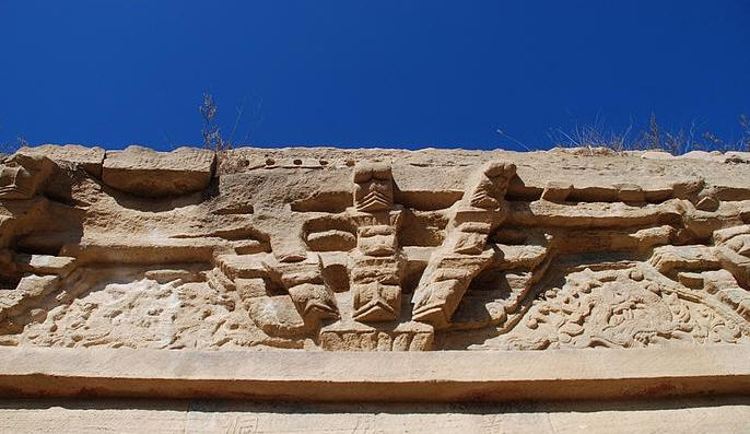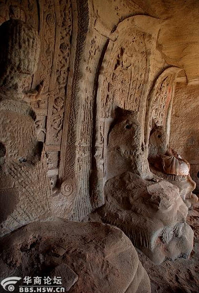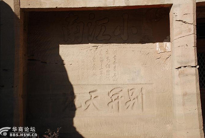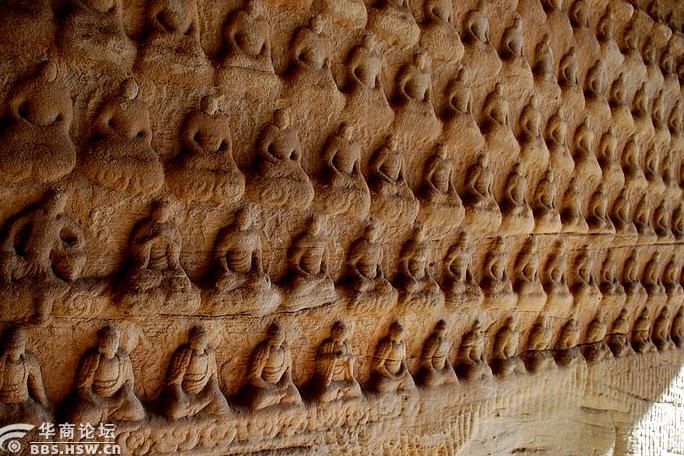 万佛洞相比千佛洞要好很多,也许是由于万佛洞的洞门至今比较完好,所以洞内的风化可能相对要轻微些,站在外面看万佛洞的大门依然很壮观,外看像是两层的三间开间的结构,佛洞的洞门开在中间一间处,门前还有一米多宽的门廊和两根以山势开凿的石柱,和现代的建筑有点相似,两边的开间上没有窗户,但墙壁上雕刻的字迹很是清晰,和一座宏伟的建筑很相似,看着非常的威严神奇,佛洞门眉上“万佛洞”三个大字非常的清晰可见。