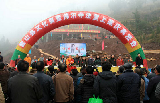 转过一个弯,就远远地望见了佛尔寺。他有三层殿,最上面的叫“法堂”,法堂的下层是“三圣窟”,中间的叫大雄宝殿,最下面的叫“弥勒殿”。目前只有法堂修好了。佛尔寺沿山而建,看起来宏伟壮观。在这里有许多老百姓当义工,有的在给人们送香、有的在敲钟、有的在放音乐………。