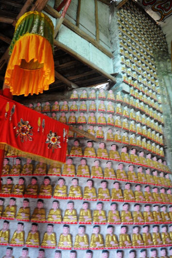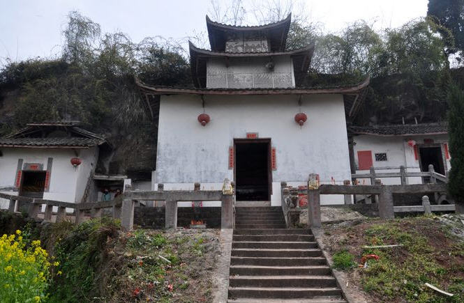 宛如一位久经沧桑的老人一般,只见古寺巍然屹立在仁和寨的半山腰上,前临悬崖,背靠峭壁,前后左右三座大殿呈品字形排列,飞檐翘拱,青瓦屋面。殿前建有青石栏杆,雕花栏杆上刻有石瓜,安放有威风凛凛的护法神,石辟邪,多级青石台阶直通大殿。中间是观音大殿,殿内正中供奉有庄严慈祥的观音大士,殿内木柱上挂满善男信女虔诚敬献的红布,四条蟠龙张牙舞爪绕柱凌空飞腾,气势恢弘。左边是供奉玉皇大帝、王母娘娘、太上老君、雷公、财神、文曲星等等神仙的大殿。右边则是供奉城隍、弥勒佛等等神灵的大殿。大殿门柱之上均写有各种警世和醒世名言,大抵均是教人诸恶莫作众善奉行之意。走进三座大殿,顿感庄严肃穆,一种敬畏之情肃然而生。