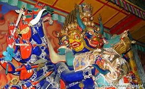 大殿里面供奉着佛祖释迦牟尼和黄教创始人宗喀巴的佛像,万余尊的泥塑小佛像,在殿内沿着墙壁陈列开去,使噶登彭德林寺的大殿成了名副其实的万佛殿。一幅幅描画着佛像的唐卡画在大殿的顶梁上高悬下来,接受着朝拜者的敬仰。幽暗中,闪烁的酥油灯虽然是星星点点,但却把巴塘人的心灵照耀得格外亮堂。此时的噶登彭德林寺是宁静的,静得让人能够听见酥油灯静悄悄燃烧的声音。从大殿出来上到二层一间小殿内,里面供奉着释迦牟尼的七岁等身像,巴塘人将这尊用檀香木雕成的佛像叫作“松觉扎玛”。寺庙特地在佛像的旁边置放了一架小梯,供信徒上前嗅闻它的檀香气息,接受佛光的洗浴。关于这尊“松觉扎玛”,