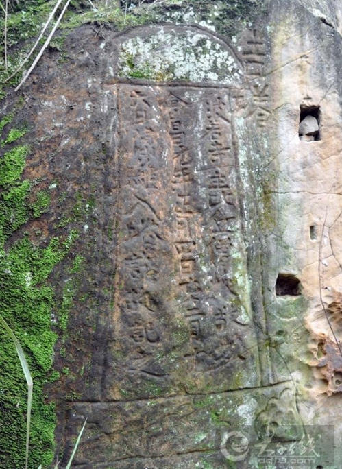 塔铭右侧是灵塔。灵塔从石壁上约两米高的位置起凿。碑与塔之间凿有大小不等的方孔,是农民搭建住房所致。正是因为农民在此建房,才遮蔽了这方绝世瑰宝,以致当我们为它剔除苔藓和泥土后,简直不敢相信它竟是如此的完美。