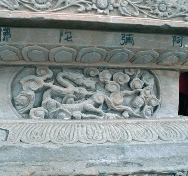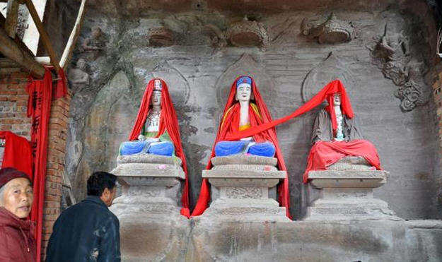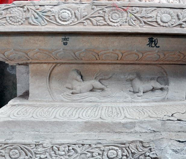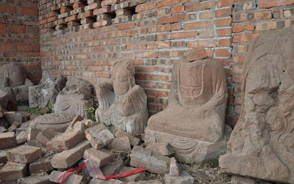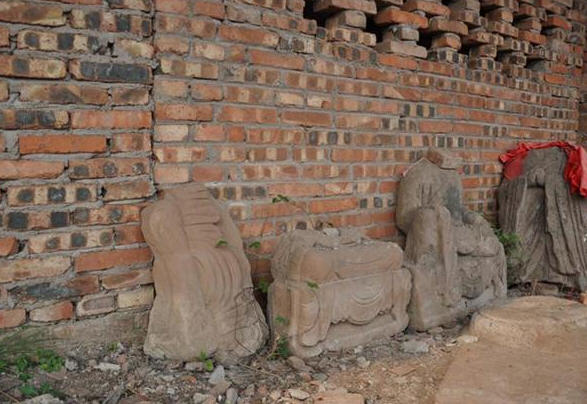 刘家寺原有一列十间殿堂,殿堂的轮廓能从地基和后壁的凿痕判断。正殿居中。在正殿废墟里,挖出近20尊残断的佛像。正殿后方的石壁上方,残留着一列莲盖,莲盖下端,分别对应着三座莲台,莲台束腰上的高浮雕动物还很清晰。莲台上,三尊菩萨只剩身躯,头和手是重塑的。在后壁上,还残留着菩萨的身光和四身武士。