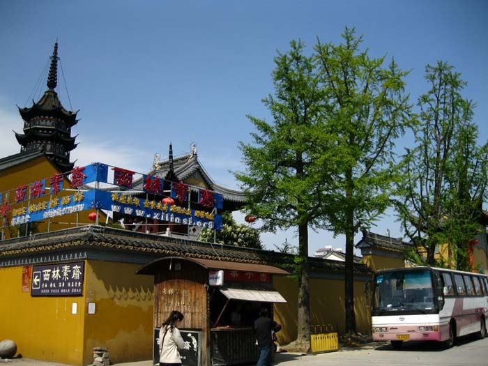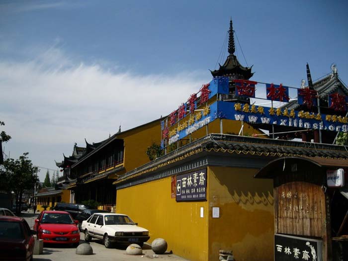 府志记载:“西林禅寺原在府庆云桥(俗称陶行桥)北,寺前建有宝塔,高七层,八角形。”寺原有齐及三层塔高的大雄宝殿。中供三尊大佛。又有大钟一口,早晚佛事,声闻数里,余音缭绕于三泖九峰之间。“百八钟声醒世梦,五千慧典印禅机。”塔东原有干霄蔽日的罗汉松两株,传为宋代扩寺时僧睿圆应法师所植。傍松建有“双松精舍”;俨然佛教道场。相传这里曾是一片神秘的土地,每逢秋天,雨霁初晴之傍晚,此处一片林带沐浴于金色的秋阳里,层林染金,格外亮丽。林塘里满是菱叶和荷叶,雨珠滚动,金光闪耀。在三泖九峰之间,唯独府城西门外的这片乔木林中,年年于此时有许多神鹰翱翔其间。南宋华亭诗人许尚见之,特题《西林》一首为赞:“林外初晴后,斜阳满芰荷。频来指灵鹫,此去路无多。”此诗曾刻石寺中,成为僧睿此处扩寺的脚注,也是后人复名西林的缘由。