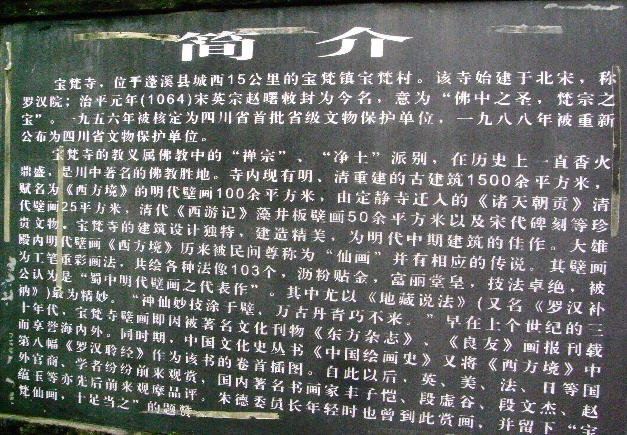 “神仙妙技涂于壁,万古丹青巧不来”。宝梵寺及壁画于1956年公布为四川省第一批省级文物保护单位,2004年已正式获准申报全国重点文物保护单位。