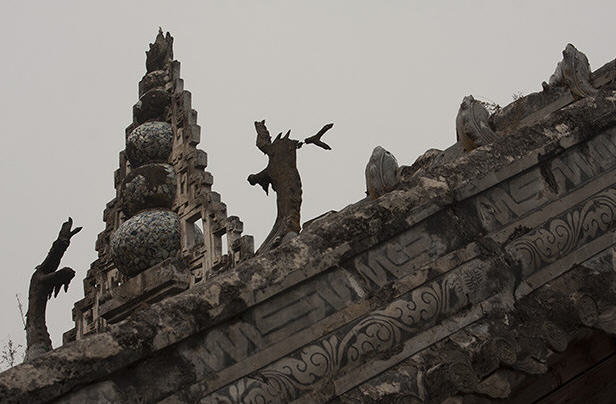 出柳树镇,从通济山麓沿数百级石阶而上,有高六米的四层青石字库,有龙纹砖砌牌坊,牌坊两侧有对联:"彼岸向北流,有白鹤玉珠,左辉右映;斯山即西土,共青堤榆柳,日异月新"。西边侧门上有"龙盘""虎踞"二字,字体遒劲,为宋代名人手书,牌坊图案文饰皆极精美,特别是龙形花纹,云雾缠绕,曲绕盘桓,飞动流畅,堪称绝品。可惜此难得之物竟在文中毁于伧夫俗子之手。