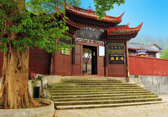 由射洪县城南下20公里,便是中国名酒沱牌曲酒的总部所在地柳树镇。镇南通济山半山腰上,绿荫掩映中,一大片殿、阁、楼、坊等古建筑若隐若现,朝晖夕阴,红墙碧瓦,古意盎然,这便是川中著名的开放寺庙,禅林胜地饶益寺。