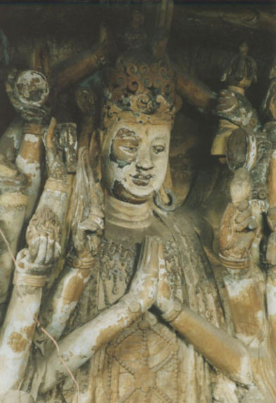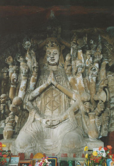 寺后岩石上刻有千手观音坐像一躯,身高10米,宽6米,着双颔下垂衣,头戴宝冠。造型庄重,线条流畅,为宋代所刻。虽经风雨,造像基本完好。旧传寺下尚有古井二口,清泉不竭,夏季水涨则入沱江。