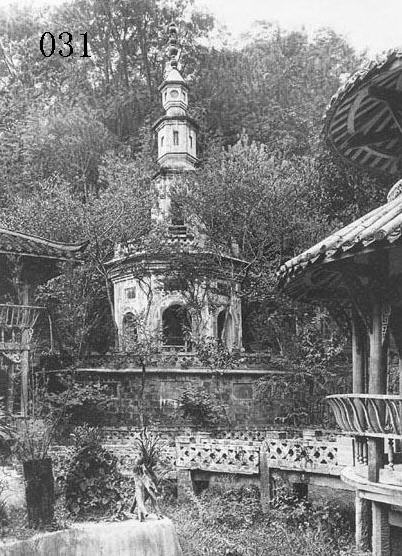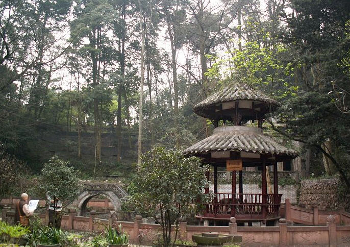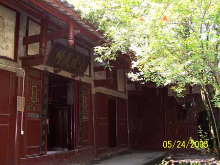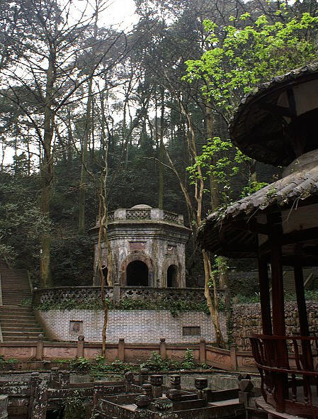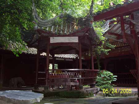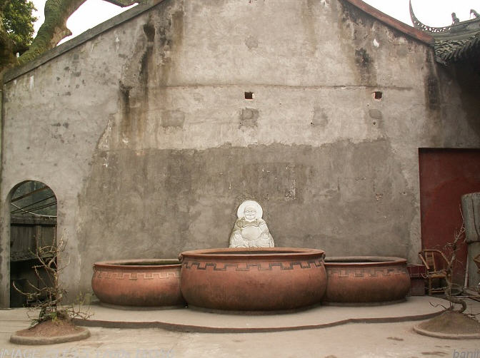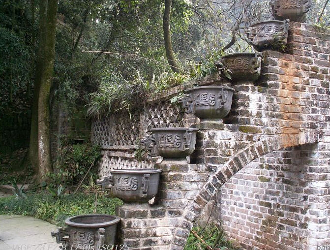绿树掩映中的金凤寺 金凤寺建筑的整体布局,寺内是典型的川西民居型庭院式群体建筑,周边的亭、榭、迟、坊、廊、圆、墓、塔错落有致,殿堂具明清风格,镂雕石缸工艺精湛。