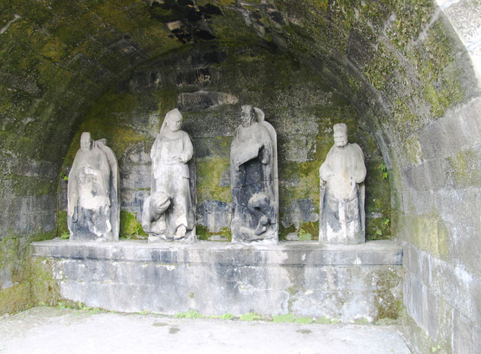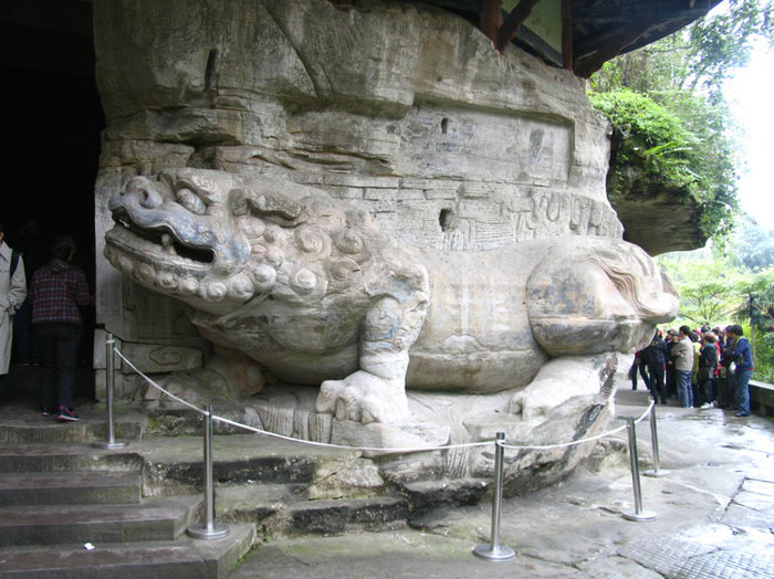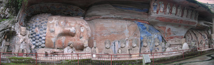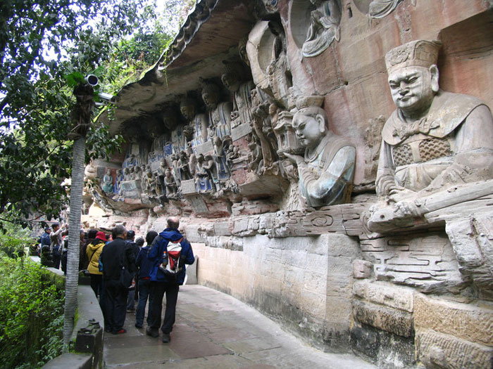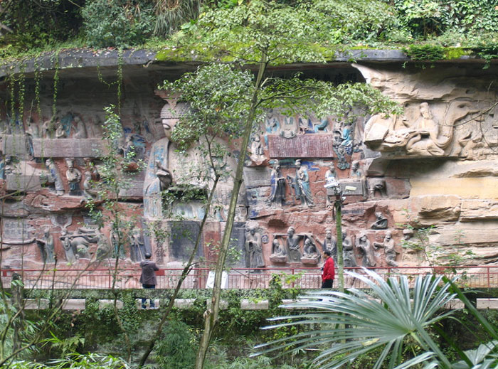 大足号称“石刻之乡”。宝顶之名始于石刻创始人赵智宗(亦名赵智凤)。大足境内石刻约四十多处,而圣寿寺所在的宝顶山最为集中,规模最大,艺术价值最高。同时宝顶山又是佛教徒朝拜的圣地,历史上有“上朝峨眉,下朝宝顶”之称。赵智凤的功绩,不仅创建了圣寿寺,而且还创刻了宝顶山的摩崖造像。宝顶山的石刻,主要分两组,即大佛湾和小佛湾。大佛湾“东、南、北三面危崖峭壁,长约五百余米,凿有三十一个龛窟,碑碣七处,题记十七则,舍利宝塔二座。石刻内容有:护法神像、六道轮回图、三仙人影修陀罗尼、西方三圣、千手观音、释迦涅槃圣迹图、腋下诞生图、九龙浴太子、孔雀明王经变、父母恩重经变、大方便佛报恩经变、地狱变、柳本尊行化道场、十大明王、圆觉洞、牧牛图等。其规模之宏伟,可与敦煌、云岗和龙门石窟比美,堪称中国佛教的第四大石窟造像。小佛湾是赵智凤最早创刻的造像,是大佛湾造像的兰本,原来规模相当宏伟,殿堂用石砌成,殿内四周上下满刻着佛、菩萨像。此外,小佛湾还有法身塔(俗称经目塔)和石洞。法身塔高十米,三层、四方形,全塔四周共刻约五百八十四部经目,其中有许多早已失传的经名。石洞即毗卢庵,其中除刻有毗卢佛像外,还有许多佛、菩萨像。整个小佛湾的石刻,虽屡遭破坏,但仍不失为一座瑰丽多彩的古代艺术宝库。