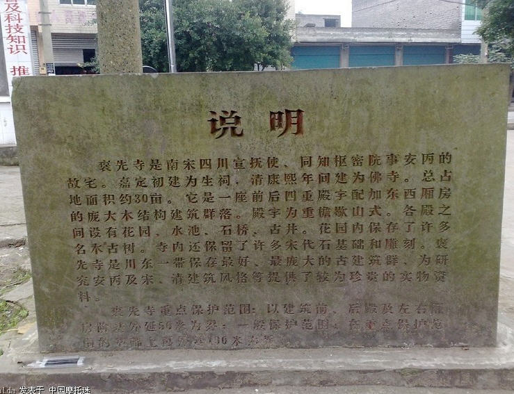 位于华蓥市西永兴镇的褒先寺始建于南宋,初为安丙私宅,安丙去世后用作生祠。南宋末年为纪念安丙建寺,明代毁于兵灾,清朝康熙、乾隆年间重修。《褒先寺关圣殿碑》载:“距州三十里许,褒先寺者,宋安居定公遗宅,施以建梵王宫也。明季毁于兵燹,而故址宏廊。康熙初,守尧禅师号道一,率徒庆之、庆志、庆顺由黔来,次第复古。”