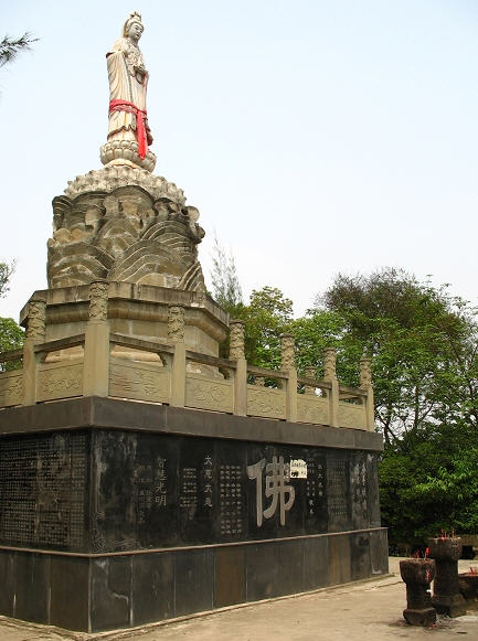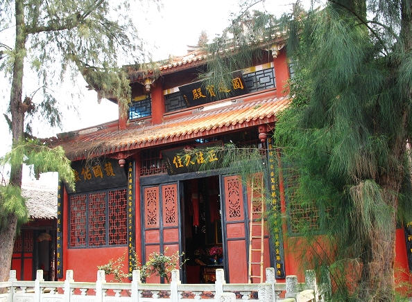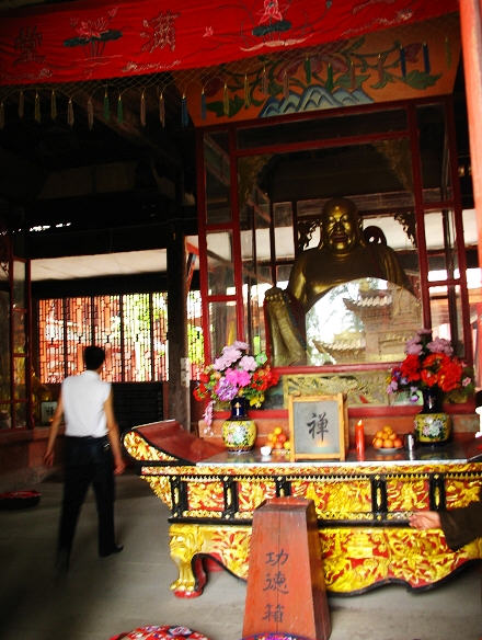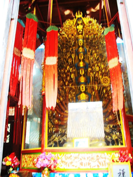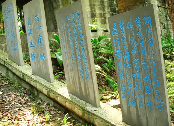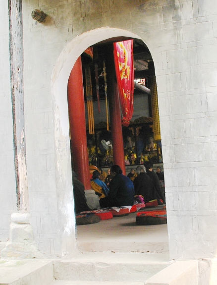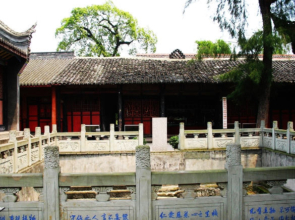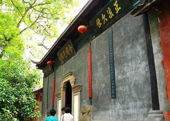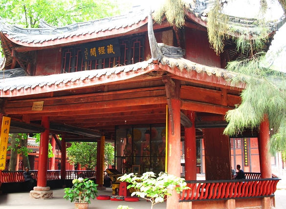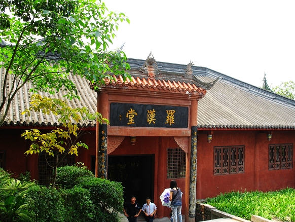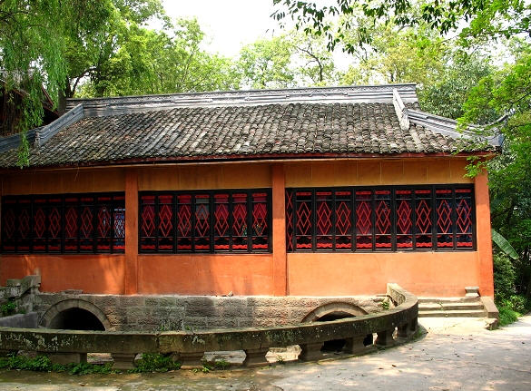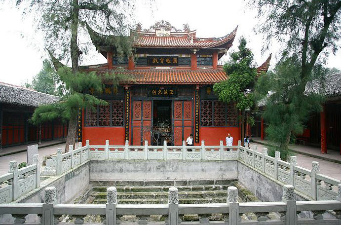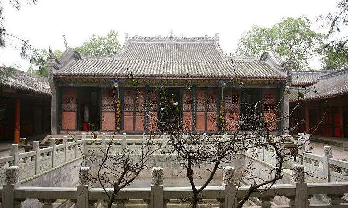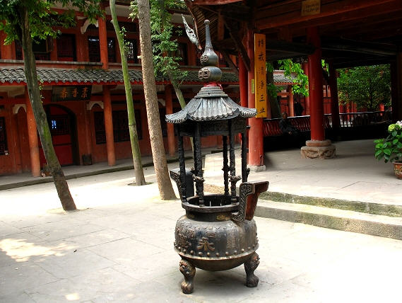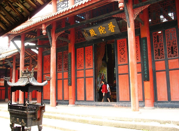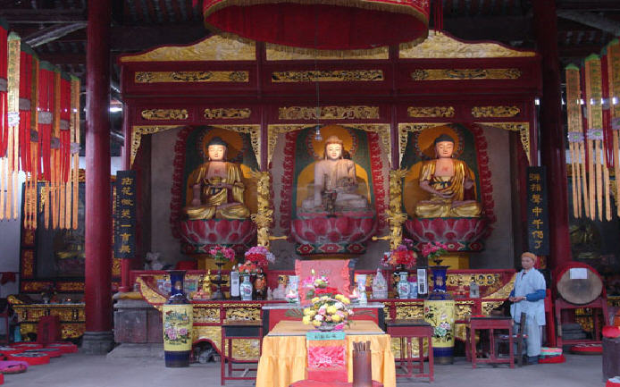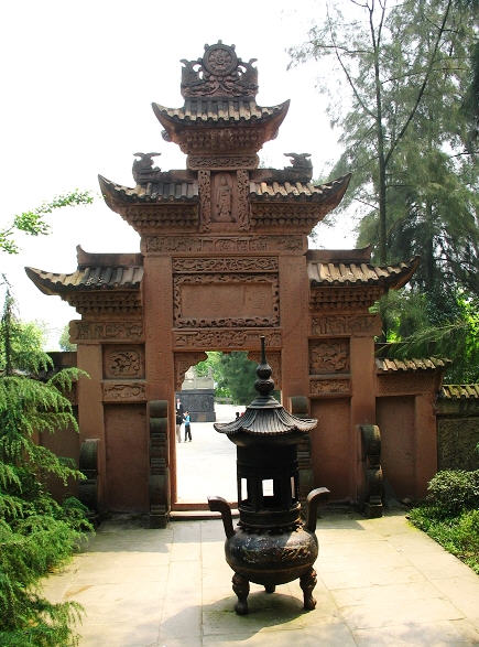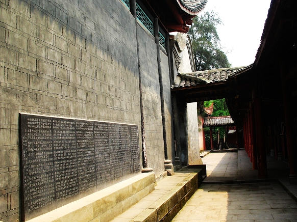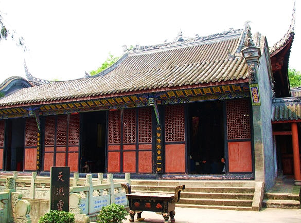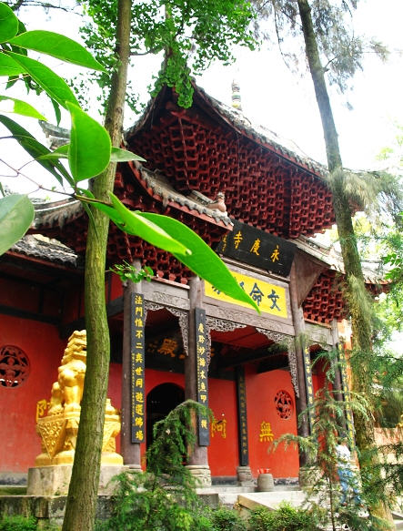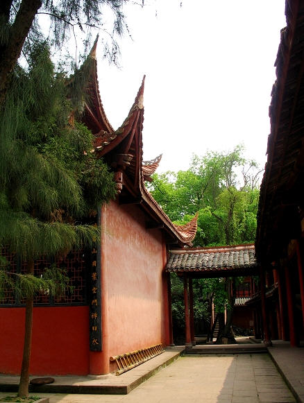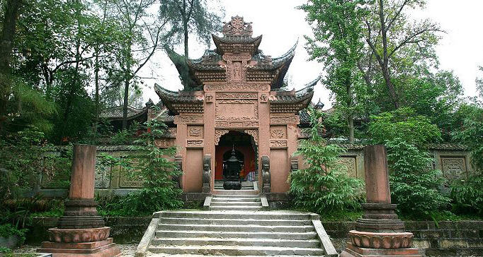 资中重龙山上的永庆寺。寺始建于唐、宋年间,明洪武、嘉靖、清康熙、嘉庆年间都曾重修,始具现在规模。全寺由寺前照壁、山门石坊、天王殿、普陀殿、八角亭、大雄宝殿和左右厢房(包括禅堂、食堂、僧房、小卖部等)组成,是现全县保存最完整的古寺庙。照壁是一座耸立在寺前广场间的红色粉墙,中塑“福”字。善男信女来此,莫不闭眼前去摸福祈愿,以求佛祖保佑。山门石坊,五间六柱,高达9米,如意斗拱,重檐九脊。坊顶耸“佛火”石炬。正中横额锑“重龙古迹”由字。左、右石柱携两副对联。一副是:“双鹤横江缅仙吏遗百尺楼头寻鹤驾;重龙绕郭踵名贤旧址三台渡口望龙门。”鹤为灵禽,古代重龙山苍松翠柏,郁郁葱葱,常有白鹤飞来山上栖息,故联语以鹤嘀景。相传南宋状元赵逵曾来山上读书,下联因有“踵名贤旧址”、“望龙门”等语。另一联是:“镜影远从天上落;岚光晴向日边开”。“重龙晴岚”是古资州八景之一。明奉直大夫张监曾有诗云:“非烟非雾锁重龙,雨雾尤奇色更浓。老树模糊山掩蔼,游人如在白云中。”可见景色之秀丽。 石坊背面正中亦携有四字:“西蜀名刹”。两旁石柱也有一副对联:“倚汉凌云洵是西方法界;闻香掬水分明胜地曹溪。”