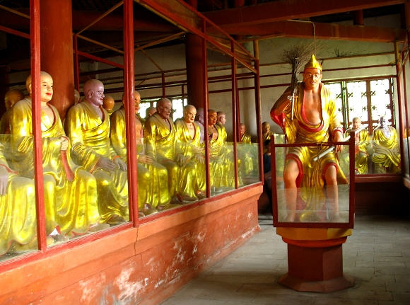 资中重龙山永庆寺仰止堂内挂着三幅巨大的画像,正中一幅是唐初禅宗保唐禅派的始祖智先禅师;左面一幅师智先的法嗣处寂禅师;右面一幅嗣处寂禅师的法嗣韩国王子无相禅师。处寂禅师的须弥座下画了一只老虎,目光炯炯,形态传神;三位禅师则是慈眉善目,目光中闪耀着一缕慈禅的禅韵。人们一进禅堂,便同这些禅师的目光对面而视,然而令人不可思议的是:这些目光会“动”,人们不论站在禅堂的什么方位,禅师们的眼睛都是向着你的;你站在左面看去,他们的眼睛与你对视,你慢慢地走向禅堂地中间,他们的目光便随着你的身子“移动”到了中间;你走到了右边,他们的目光也随之到了右边。最神奇的是那只老虎,它不仅眼神会动,连颈子都会转动。这是一只横向而卧的斑斓猛虎,黄色,目光特别灵活传神,它似乎是担负着佛门圣地的保安工作,始终向着你虎视耽耽。