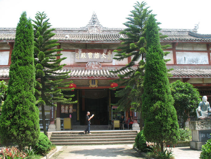 大雄宝殿是原藏经楼改建而成,楼房简瓦宝顶、红漆柱子,黑漆正门。正中塑金光闪闪的释迦牟尼佛;背后是西方三圣,文殊普贤菩萨、地藏王菩萨;两旁是十八罗汉,表情自然,栩栩如生。