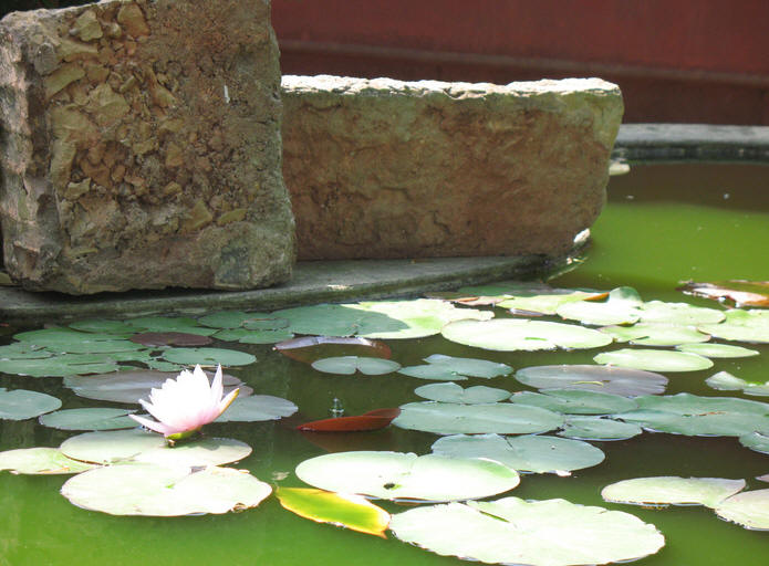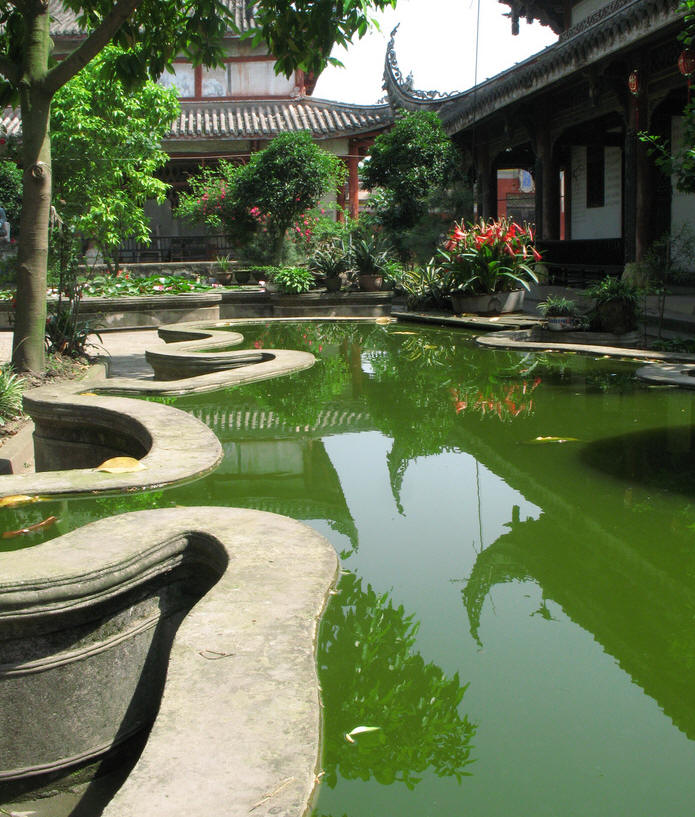 院坝中间建有莲池、假山、花台,使寺内有山、有水、有花草树木,一年四季名花盛开,香气袭人,更添了寺庙的新鲜空气。