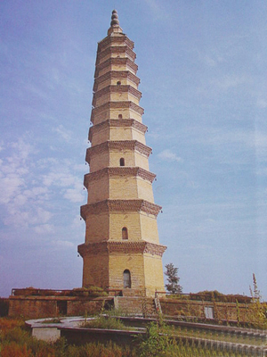 宽大的寺院有一座宝塔,高十一级,名永寿塔,乃佛教浮屠的历史遗产,塞上文明的座标。从地理位置上看,兼有镇河塔的含义。