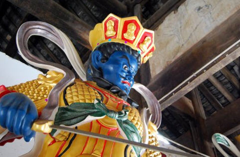 天王殿左边,还有一座火神庙。火神是中国神话中民间俗神信仰中的神祇之一,但各民族各地区祭祀的火神形象和来历是不一样的,就是汉族的火神崇拜,各地区也不相同。但汉族一般都以祝融为火神,南方又称火德星君,四川等地还以夏历四月初八为火神“生日”。下图是传说中的火神。