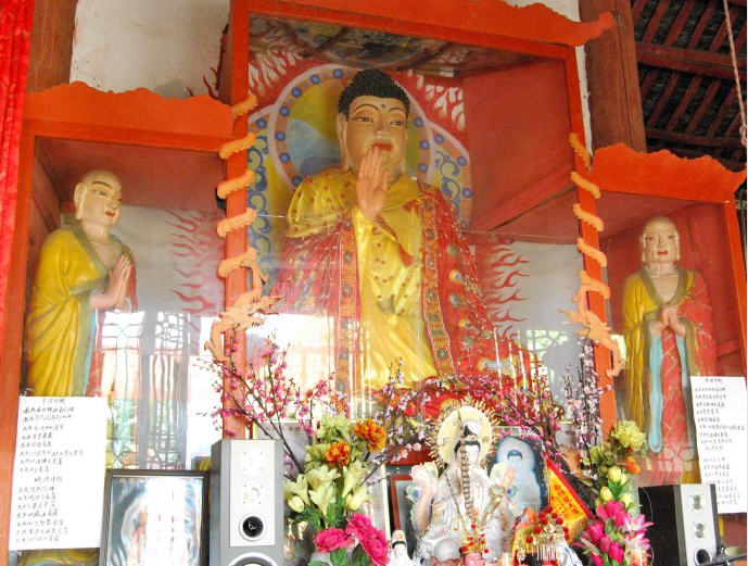 大雄宝殿内,供奉佛祖释迦牟尼,左右两边侍立着摩诃迦叶和阿难陀。佛祖施无畏印,这一手印表示了佛祖救济众生的大慈心愿,据说能使众生心安,无所畏怖,所以称为施无畏。