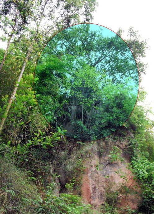 玉蟾寺主持镇海法师是个热心人,据说曾被全国政协副主席杨汝岱特聘为专职家庭川菜厨师,他不仅热情地给我们介绍玉蟾寺的情况,还带我们围着寺庙参观。在大雄宝殿右侧,有往生堂,堂前有一天然异石,状似象头。而这块崖上的石头及石上的树木,又貌似观音插满柳枝的净瓶。