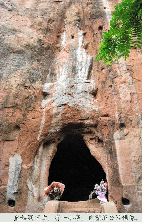 仙姑岩中间,还有一个巨大的石洞,现在都还有很多孩子钻进去玩耍。仙姑岩底部正中,有一岩洞,洞门高2.2米,宽1.9米,里面供有观音像,这个洞叫做皇姑洞,也叫罗汉洞。