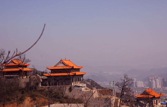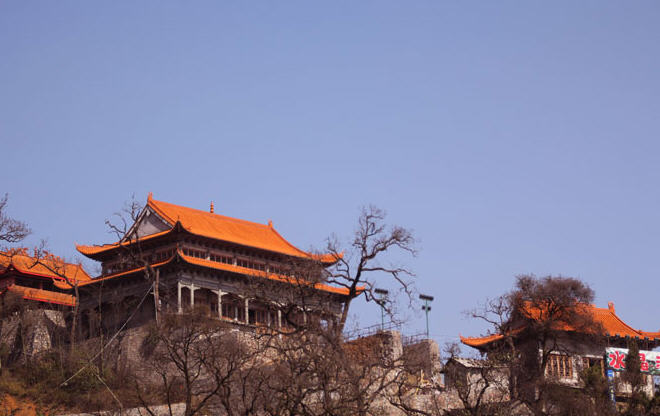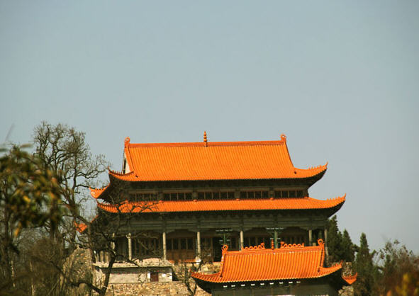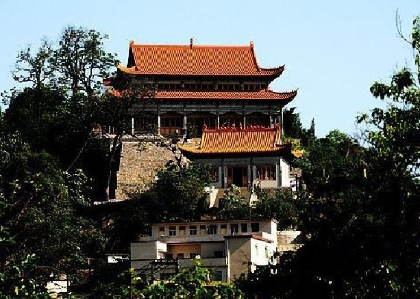 北固山山势雄竣,海拨1500mm左右,林木蓊蔚,石径迂回。据史记,山上庙宇建筑依山势由低到高,层层叠进,共五重。其结构均为穿斗式木结构,除玉皇阁为庑殿顶外,其余均系硬山顶、小青瓦屋面、格子门、棂花窗,鼓形石柱础。
