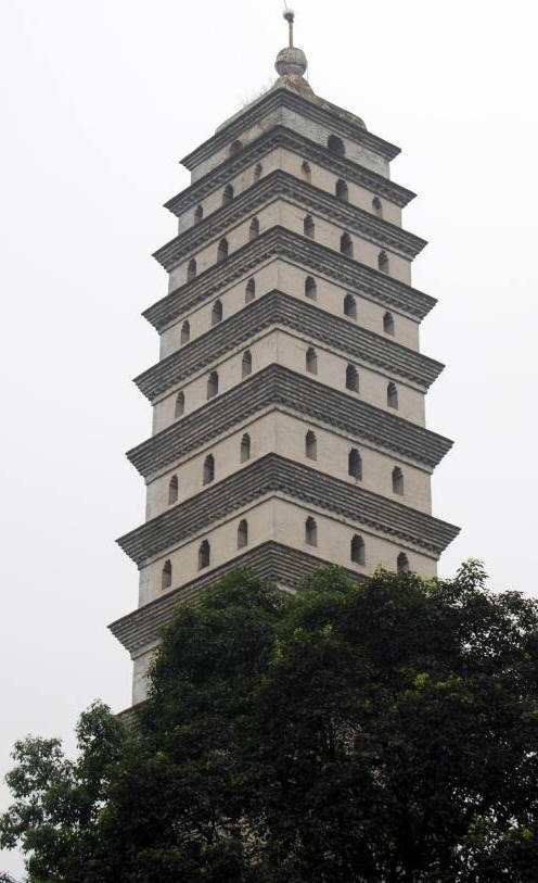 该塔坐东向西,砖石结构,13级密檐式,塔顶为穹窿顶。塔身呈正方形,层层内收,每层均开窗,内空7层。塔门在西方,高4.16米,宽1.36米。塔基高7.1米,最底边长6.1米。塔刹高8米,塔体通高47米。整个塔身用火砖砌成,砖长0.42米,宽0.42米,厚0.08米,实为方砖(个别不同)。此塔是在唐塔基础上仿唐式建成,对于研究唐代建筑有一定参考价值。下图是白塔上的窗户和穹窿顶。