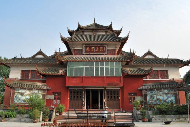 大雄宝殿后面,就是颇为气派的圆通宝殿,宝殿占地面积1000多平方米,楼高三层,四方龙角飞檐走兽,仿古逼真,宏伟壮观,内有高达16米的千手观音塑像形象逼真,容貌慈祥而庄严。圆通殿的修建和塑像历时三年,耗资500万元左右,是目前四川境内最为宏伟、最具规模、最有参考价值的千手观音殿之一。