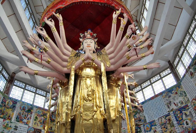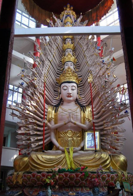 四面千手观音的正面,有两手各执宝戟,这是宝戟手,能辟除怨贼;左面千手观音双手执钺斧,是为钺斧手,能除一切王难;背面千手观音两手各执三股戟,据说叫做五股杵手,能降伏天魔外道;右面千手观音双手执锡杖,谓之锡杖手,代表慈悲覆护一切众生。下图是四面千手观音右面像。